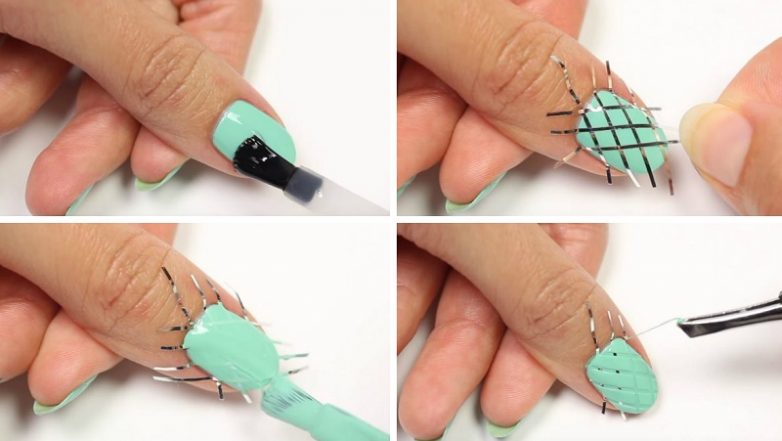 Этот маникюр делается с помощью всё тех же лент для дизайна. В зависимости от базового цвета геометрические линии могут быть как прозрачными, так и цветными.