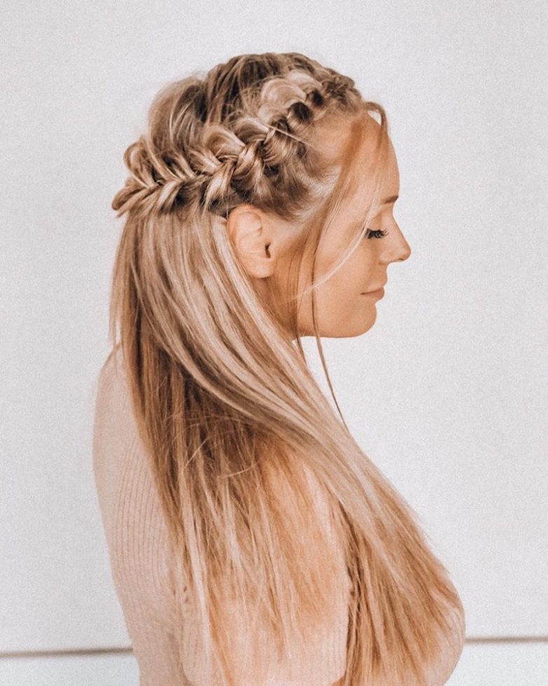 Сплетённая вокруг головы французская коса с распущенными волосами