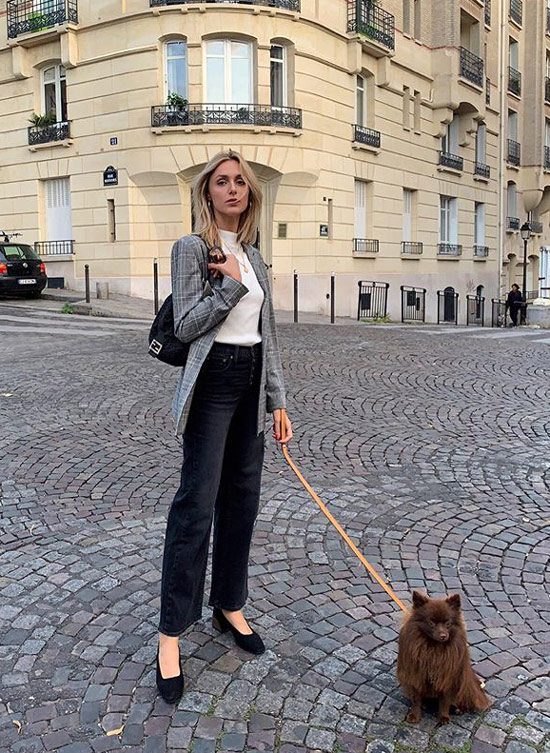 Когда особо нет времени наряжаться, но хочется выглядеть модно и стильно, то парижанки надевают пиджак в клетку немного приталенного покроя с брюками черного цвета. Элегантности образу добавляет удобная обувь, а именно туфли на невысоком каблуке.
