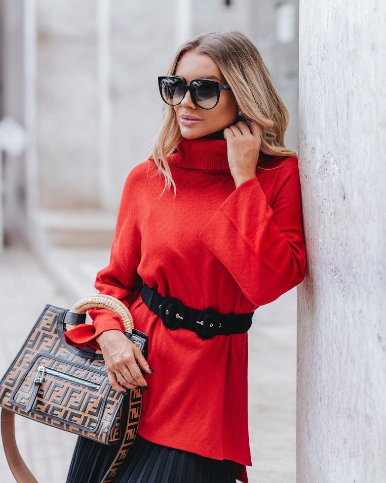 Не бойтесь этой осенью использовать в своем луке также такие предметы гардероба, как свитера и полуверы красного цвета. Главное в данном случае стремится гармонизировать цвет с помощью более приглушенных низа и аксессуаров.