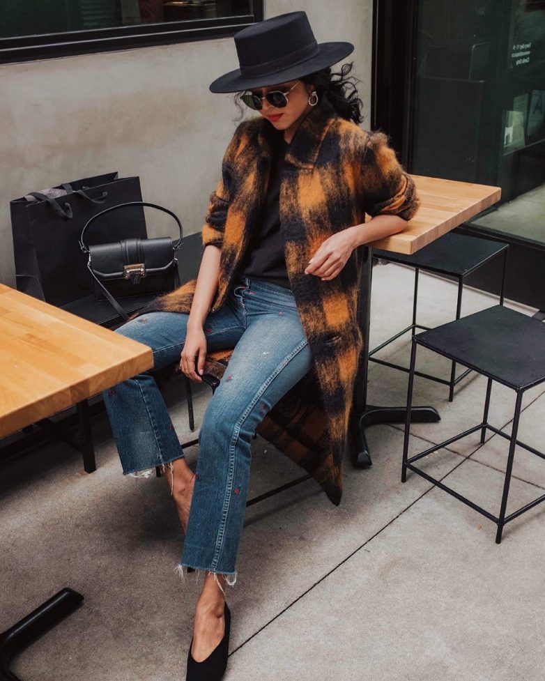 Вы можете попробовать использовать в своем образе и длинное шерстяное пальто в клетку. Последнее вполне гармонично будет работать рядом с однотонной футболкой, прямыми джинсами с высокой посадкой, балетками, а также шляпой.