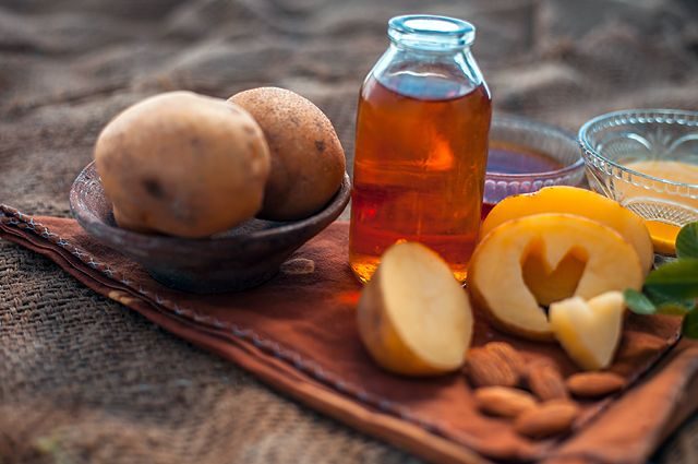 Глубоко ошибаются те, кто думает, что в картошке — один крахмал. Этот овощ из семейства паслёновых на 75% состоит из воды, а увлажнение кожи — основа основ в косметологии. Кроме того, витаминно-минеральный состав картофеля очень богат. В нём есть витамины группы B, которые нормализуют работу сальных желёз и стимулируют выработку коллагена, не дающего коже обвисать. Богата картошка и калием, который избавляет от отёчности и улучшает метаболизм в клетках кожи. Холин устраняет морщины и прыщи, заживляет микротрещины, а лютеин, работающий как солнечный фильтр, защищает от ультрафиолета. Селен и аскорбиновая кислота предохраняют от преждевременного старения, придают коже упругость и эластичность. Витамин K борется с гиперпигментацией, а витамин U отвечает за обновление клеток. Ну и, наконец, тот самый крахмал, за который картошку недолюбливают диетологи, в качестве косметического ингредиента просто безупречен: он не только отбеливает кожу, но и придаёт ей мягкость и гладкость, сужает поры и устраняет жирный блеск.