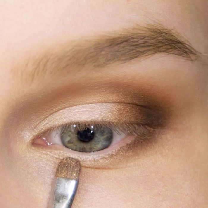 2. Маленькой плоской кистью и темными матовыми тенями в оттенке Delete подчеркните 1/3 нижнего века с внешнего уголка и продлите линию вверх до пересечения с орбитальной линией глаза.