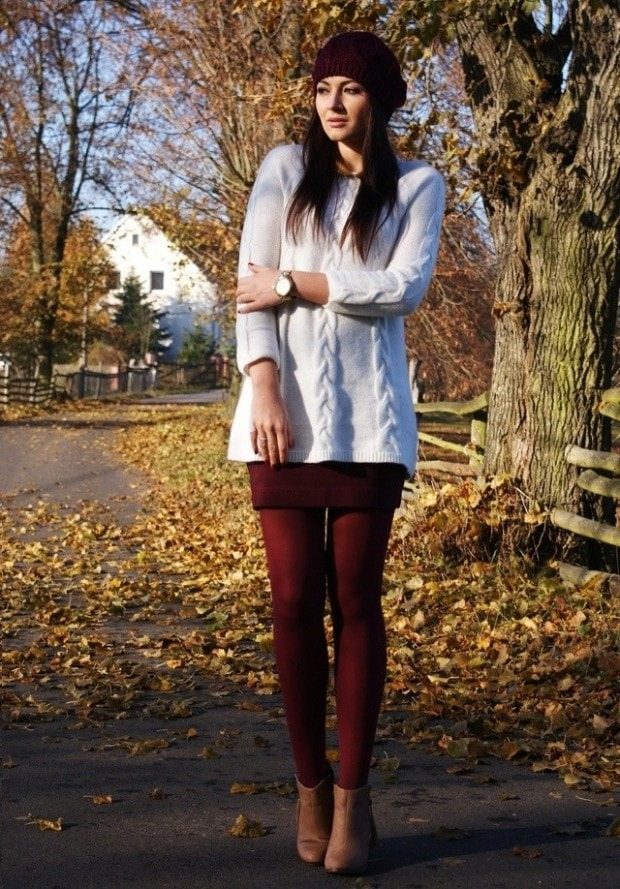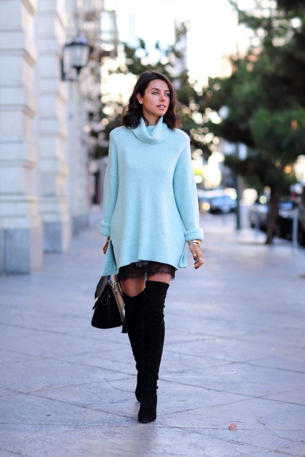 Создать изысканный и уютный образ можно, надев объемный свитер вместо платья. Если Вы добавите аксессуары, то с лёгкостью превратите обычный дневной образ в нарядный вечерний лук.