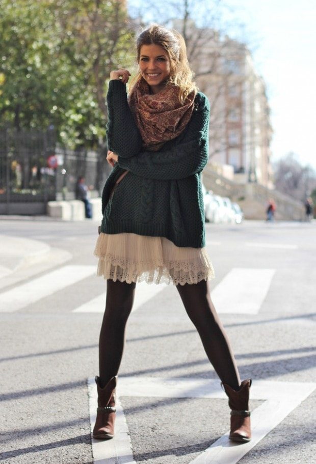 Модная тенденция этой осени – объемный свитер, надетый поверх платья или рубашки. Такой многослойный образ сделает Вас очень женственной и согреет холодным осенним днем.