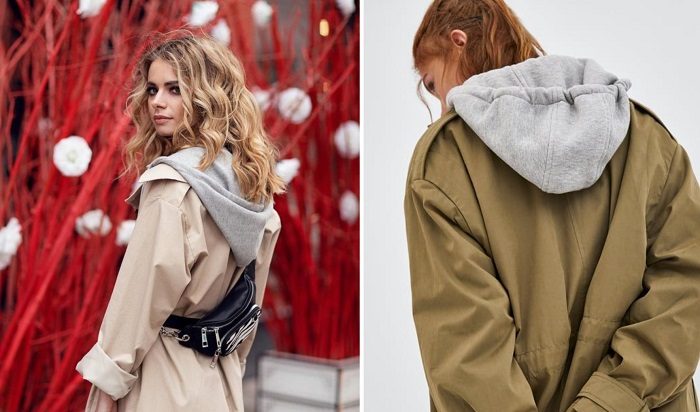 Многослойность по-прежнему в моде, поэтому с легкостью используй модный плащ в сочетании с худи или толстовкой с капюшоном. Основным акцентом такого образа станет капюшон, который располагается поверх тренча. Образ уместно дополнить джинсами-бойфрендами и кроссовками или кедами.