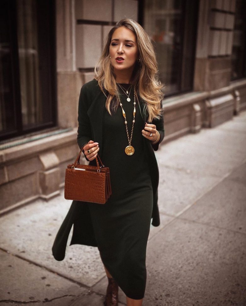 Красивое платье чайной длины приталенного силуэта сделает ваш образ невероятно стильным и элегантным. Представленная длина лучше всего сочетается с туфлями-лодочками или ботильонами. А из верхней одежды специалисты советуют использовать двубортное пальто или тренч. Для зимы же можно попробовать надеть шубу.