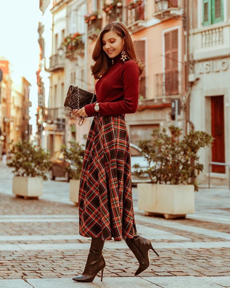 Причем клетчатая юбка вполне может быть и более длинной, например, миди или чайной длины. Такое решение можно дополнить женственным беретом, полусапожками на шнуровке, а также дизайнерской сумкой в руку.