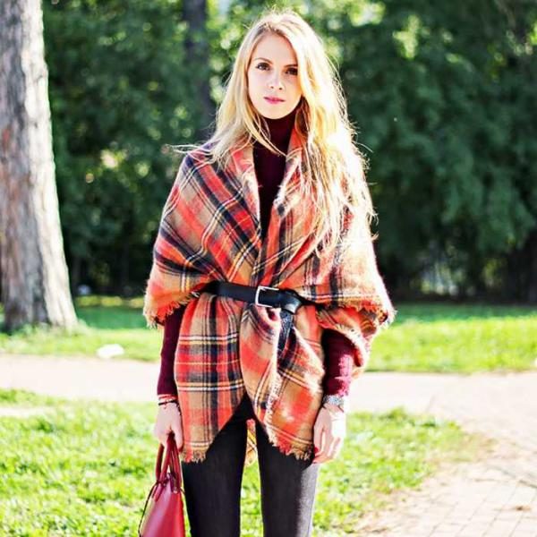 Если вы ищете наиболее оригинальный и теплый способ носить шарф этой осенью, то присмотритесь к данному варианту. Совсем недавно шарф-пончо сошел с модных подиумов и уже завоевал прекрасную половину человечества. Для создания такого образа вам понадобится широкий длинный шарф и ремень. Накинув аксессуар на плечи, расправьте его так, будто это кардиган или пальто, а затем зафиксируйте накидку поясом на талии. Получается весьма стильно и необычно.