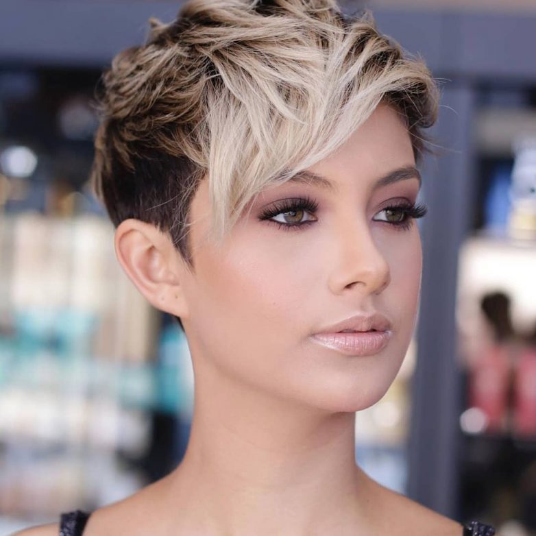 Широкие скулы, высокий лоб, заостренный подбородок – типичные черты треугольной формы лица. В этом случае, как и с овалом, следует попробовать рваную короткую челку. Если вы не сторонница такой, то выбирайте длинную челку. Это тоже отличное решение. Она подкорректирует недочеты формы лица.