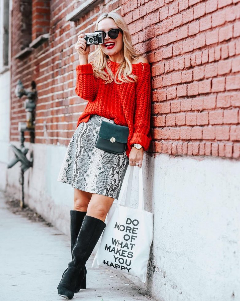 Кто сказал, что короткая юбка после 40 – это табу? Юбка выше колена вовсе не выглядит вульгарно, если найти к ней хорошее дополнение. В данном случае – свитер.