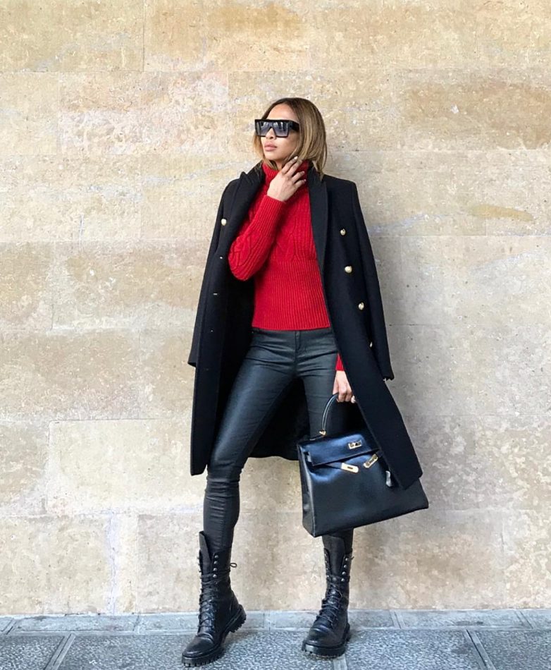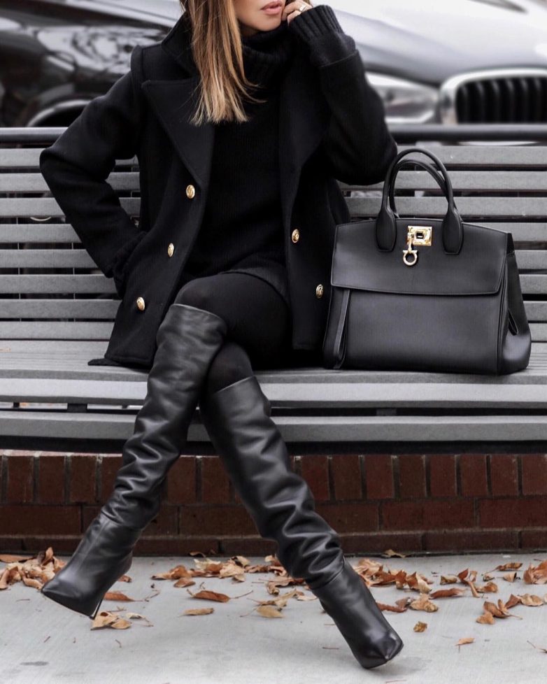 Примером чистой классики в образе является двубортное черное пальто. Главной его изюминкой являются два ряда пуговиц, которые расположены по разным сторонам от срединной линии, а также довольно крупный воротник.