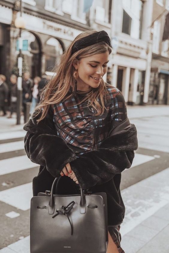 А вот на фото ниже можно увидеть комбинацию сразу из трех трендов сезона осень-зима 2019-2020. Итак, считаем, кожаные брюки — это раз, пиджак в клетку — это два и, конечно же, ободок — это три. Хотите уметь сочетать стильные вещи также? Так вперед, смело повторяйте.
