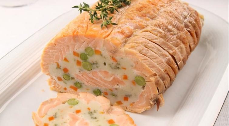 Сверху распределить оставшуюся начинку, накрыть меньшим куском рыбы. Приподнять свободные края нижнего филе и закрепить их деревянными зубочистками. Смазать рулет маслом, завернуть в фольгу и поставить в разогретую до 200 °С духовку на 35 мин. Дать остыть до комнатной температуры, затем переставить в холодильник. Перед подачей снять фольгу, удалить зубочистки и нарезать рулет порционными кусками.