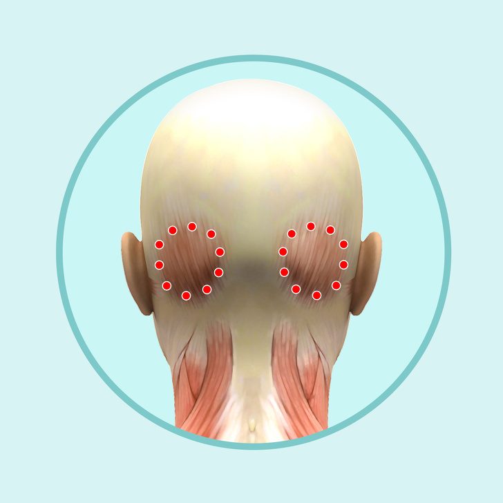 Сожмите руки в кулаки и расположите их на выступающих косточках черепа, с двух сторон от затылочной ямки. Массируйте надавливающими круговыми движениями.