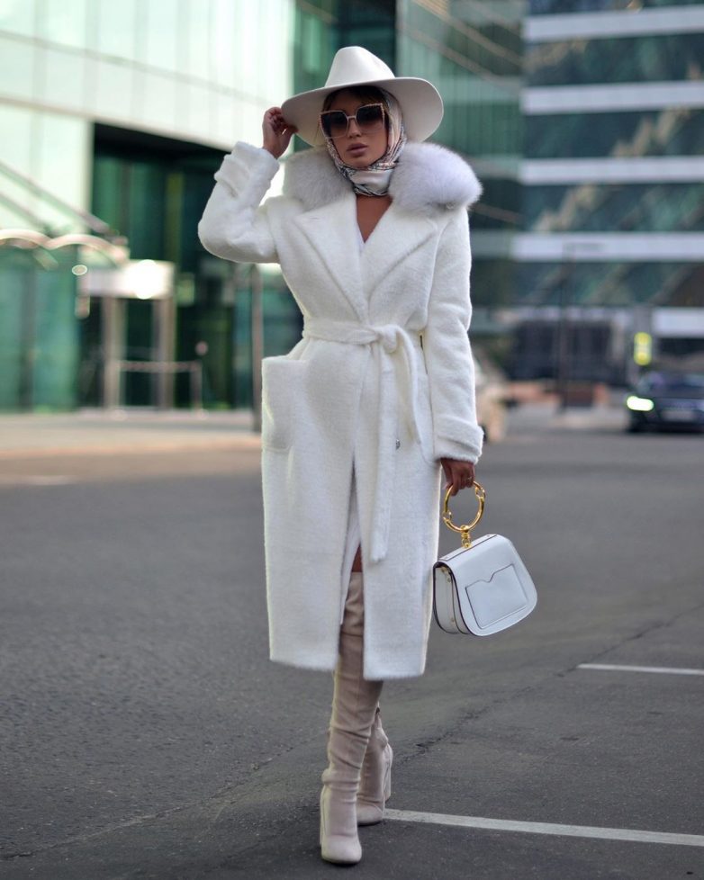 Белое пальто – такое нежное, легкое. Его носят, как правило, с такими же светлыми вещами. Светло-бежевые сапоги и шляпа с широкими краями представляют нам поистине дамский образ.