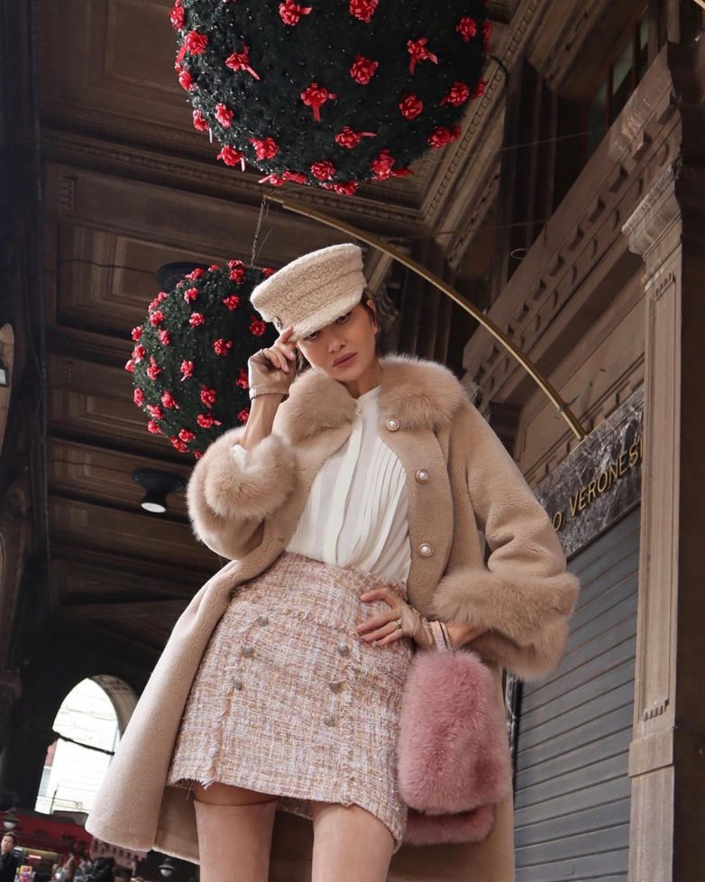 Среди однотонных и серых пальто можно найти немало ярких обворожительных моделей, например, таких, как эта. Нежно-розовый цвет выглядит потрясающе, в особенности с меховым воротником. К такому отлично подойдет что-нибудь необычное в плане головных уборов. Шляпа в тон выдает в женщине аристократку и подчеркивает ее элегантные черты.