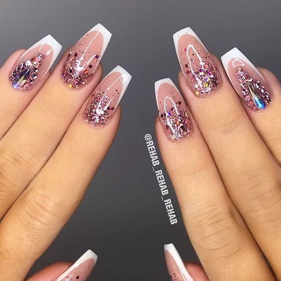 В праздники не нужно бояться выглядеть ярко и роскошно. Объединяйте в одной композиции розовый глиттер, камни и белоснежный французский маникюр. Сияние камней и блеска сделают вас заметной в любой ситуации!