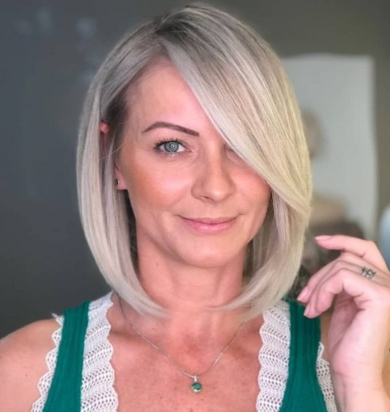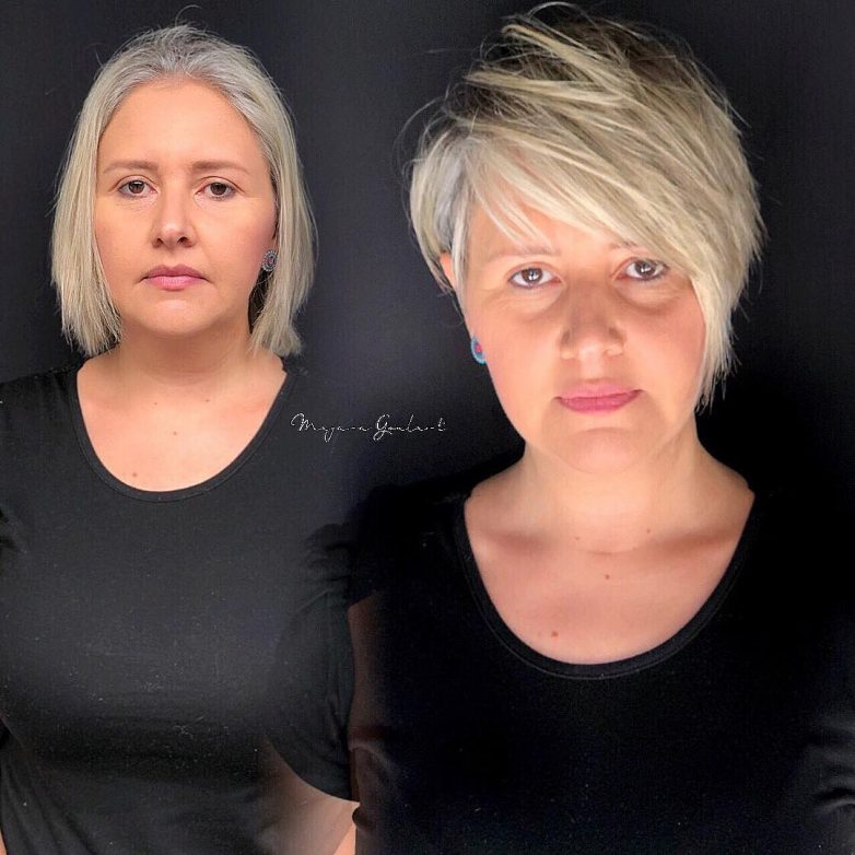Такая прическа особенно хороша для круглого, полного лица — она зрительно вытягивает овал. Редкие и слабые волосы с помощью этой стрижки будут выглядеть более пышными. В таком случае обязательно стоит сделать косую челку с пробором, смещенным набок. Таким образом вы сделаете акцент именно на прическе и отвлечете внимание от лица.
