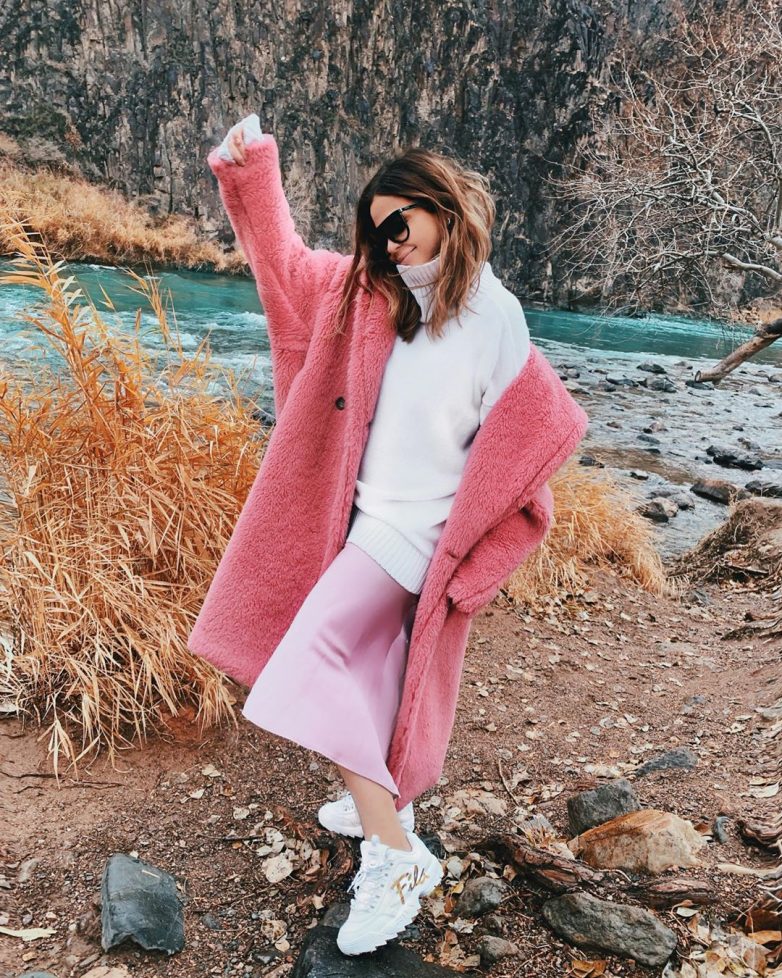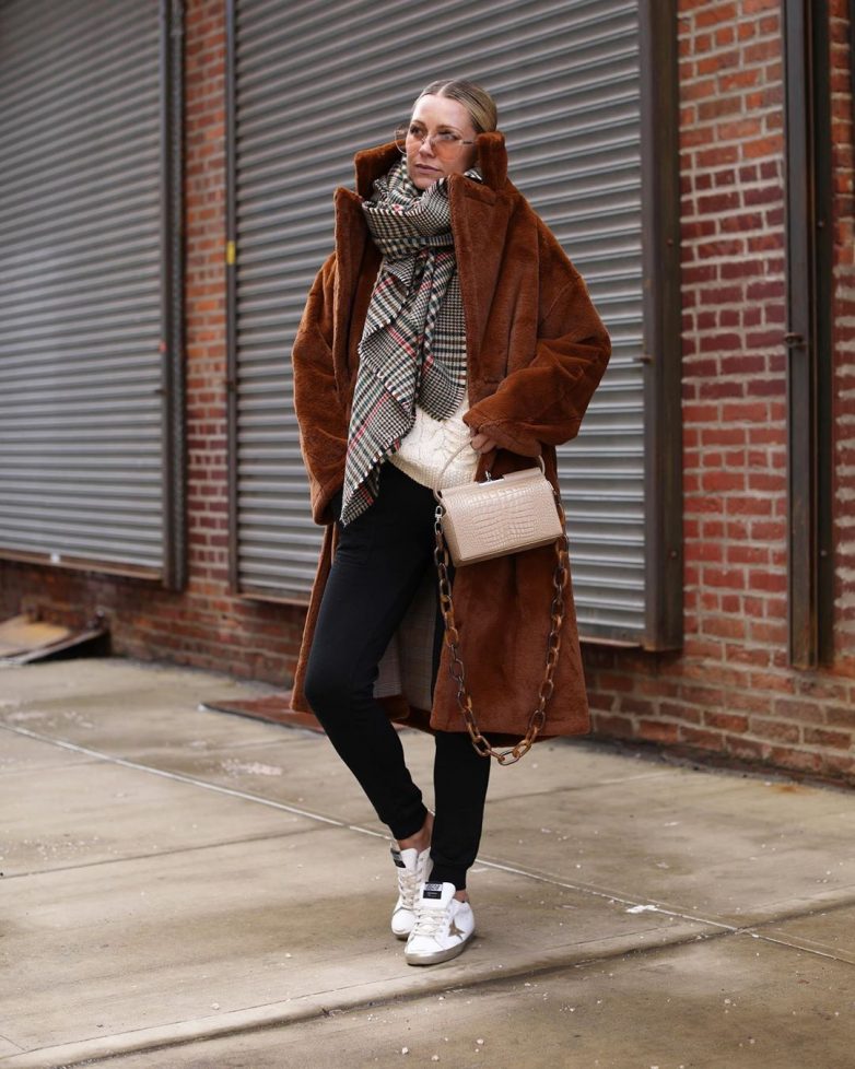 Стильная шубка оверсайз, короткая или до колен, прекрасно сочетается с брюками и обувью на низком ходу. Если вы наденете такие же широкие джинсы и обуете свои любимые кеды, стильный лук вам обеспечен.