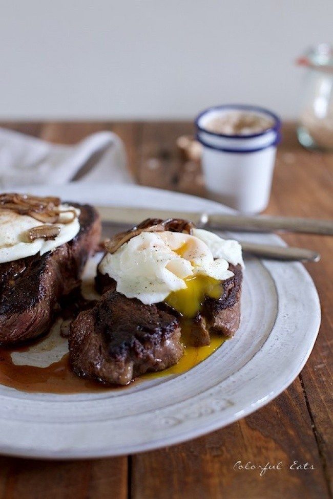 Понадобится: филе-миньон из говядины — 2 шт., морская соль, молотый черный перец, сливочное масло — 2 столовые ложки, лук-шалот — 1 шт., яйца — 2 шт.Филе приправить солью и перцем и оставить на час при комнатной температуре. Хорошо разогреть чугунную сковородку и растопить в ней сливочное масло. Обжарить филе в течение 4-5 минут с каждой стороны, отложить минут на 5, чтобы они дошли. В оставшемся масле обжарить лук-шалот. Стейки подавать с яйцами пашот и обжаренным луком.