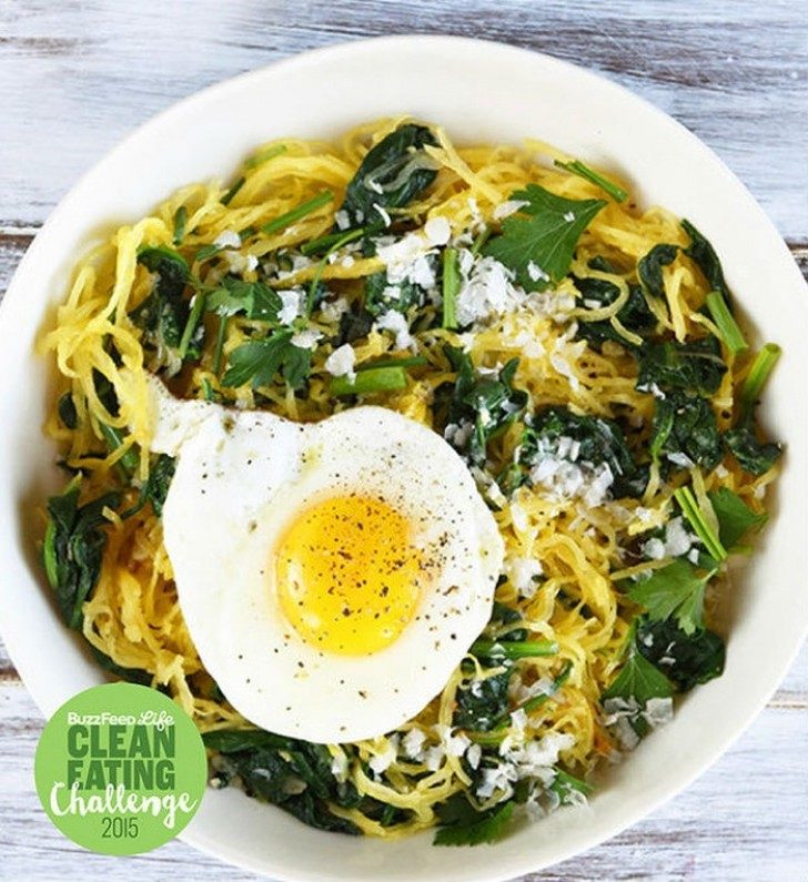 Понадобится: оливковое масло — 2 чайные ложки, лук-шалот — 1 шт., чеснок — 3 зубчика, шпинат — 150 г, пармезан — 2 столовые ложки, спагетти, яйцо — 1 шт., соль, перец, петрушка, зеленый лук. Для спагетти: тыква сквош — 1 шт., оливковое масло — 1 столовая ложка, чесночный порошок — 2 чайные ложки, соль, перец.Тыкву сорта сквош разрезать пополам, удалить семечки и запечь половинки разрезанной стороной на противне в духовке при температуре 370 градусов. Потом, когда тыква остынет, надо вилкой вытягивать нити из мякоти. Мякоть тыквы сквош очень волокнистая, поэтому из нее легко получается что-то типа спагетти. Заправить тыкву оливковым маслом, чесночным порошком, солью и перцем. Далее обжарить нарезанный кольцами лук-шалот в оливковом масле, добавить нарезанный чеснок и обжаривать, пока не раскроется аромат чеснока. Добавить шпинат и тушить, часто помешивая, пока шпинат не станет мягким и не упарится. Добавить пармезан и спагетти и слегка обжарить. Подавать с жареным яйцом, посыпав зеленью.