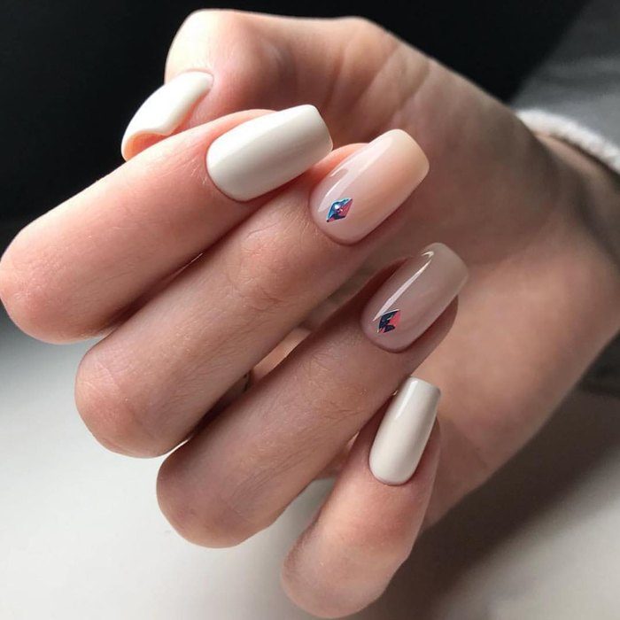 Если в вашей душе живет сорока и периодически требует добавить блеска в ту или иную деталь образа, поддайтесь соблазну в маникюрном кабинете. Обратите внимание на минималистичные блестящие вставки. Набирают популярность наклейки — строгой геометрической или, наоборот, свободной асимметричной формы.