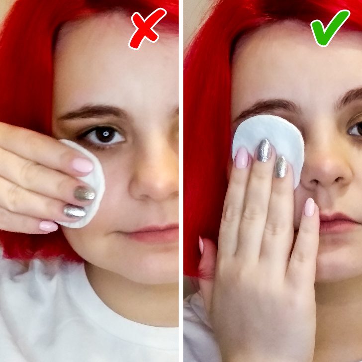 Эта ошибка относится к демакияжу. Не нужно усиленно тереть лицо в попытке удалить косметику. Так вы растянете и травмируете кожу. Нужно нанести мицеллярную воду на ватный диск и мягко приложить к лицу, подождав несколько секунд. Таким способом макияж удалится быстрее и без вреда для кожи.