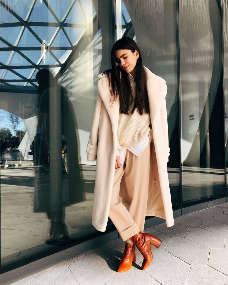 Соберите свой зимний лук из предметов гардероба и аксессуаров, схожих по цвету, но отличающихся по оттенку и насыщенности. Следующая фотография наглядно показывает, как прекрасно смотрится сочетание светло-бежевого с темным бежем. Более темный оттенок в данном луке выступает в роли яркого акцента.