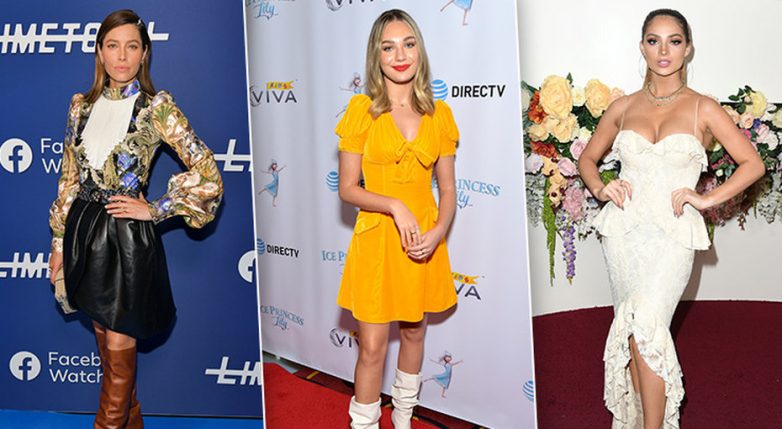 Белые сапоги с присобранным голенищем выглядят достаточно агрессивным и динамичным аксессуаром. Понятно, что танцовщице Мэдди Зиглер хотелось похвастаться стройными ногами, и она выбрала короткое платье к сапогам. Но наивный и слегка детский покрой платья такого яркого жизнерадостного цвета кажется слишком диссонирующим с такой обувью.