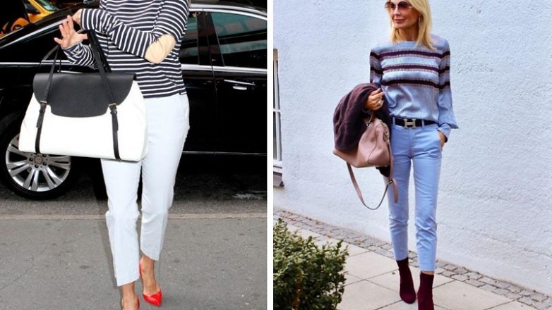 Джинсы-клеш для женщины после 50 лет могут быть исполнены с высокой посадкой, что приумножает их корректирующие свойства. В такой одежде силуэт удлиняется, фигура становится стройнее, ноги длиннее, а образ получается ультрамодным.