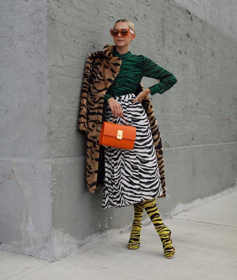 Для юбки-трапеции лучше выбирать однотонные ткани или с традиционным геометрическим принтом. Для зимнего варианта: геометрические формы, клетка, полоска, ячейки. Летний фасон может содержать цветочный принт. Лучше не использовать в образе юбку-трапецию с животным принтом, так как простой крой и своеобразный рисунок сделает образ дешевым.