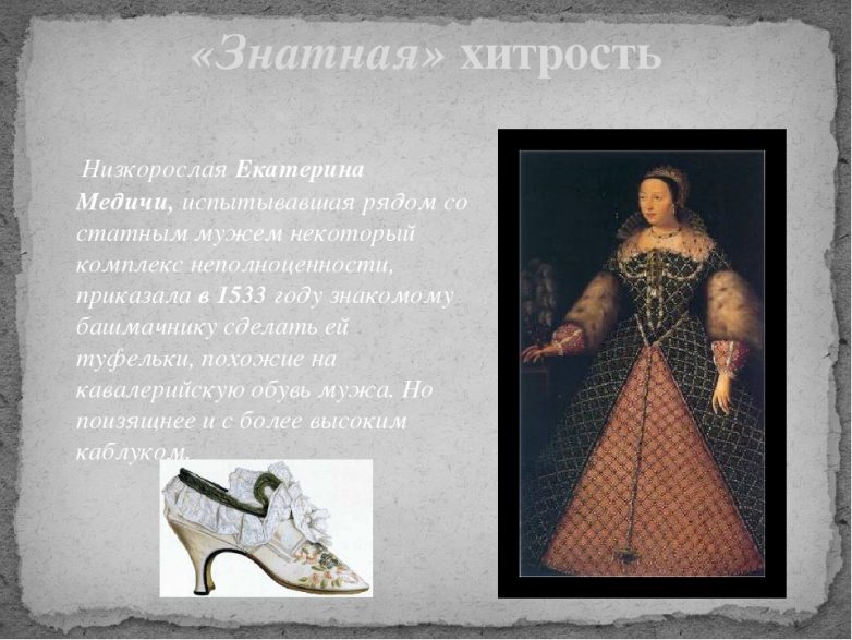 Первые туфли на каблуках возникли во Франции в начале 16 века. Мужчинам было удобно гарцевать в них на лошади. Первой дамой, использовавшей каблуки в своем гардеробе, стала Екатерина Медичи.