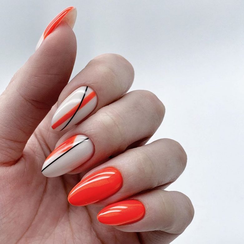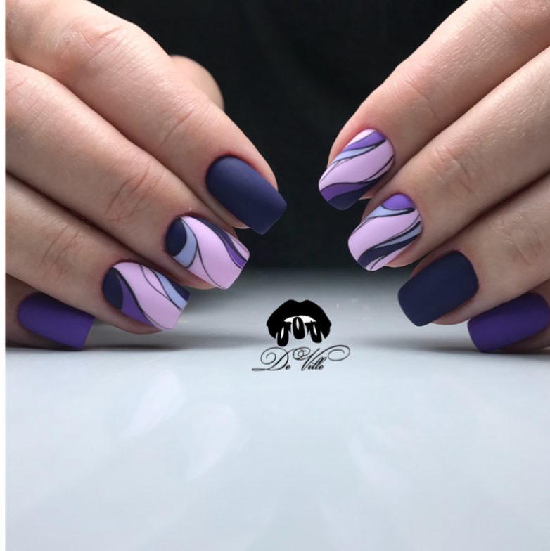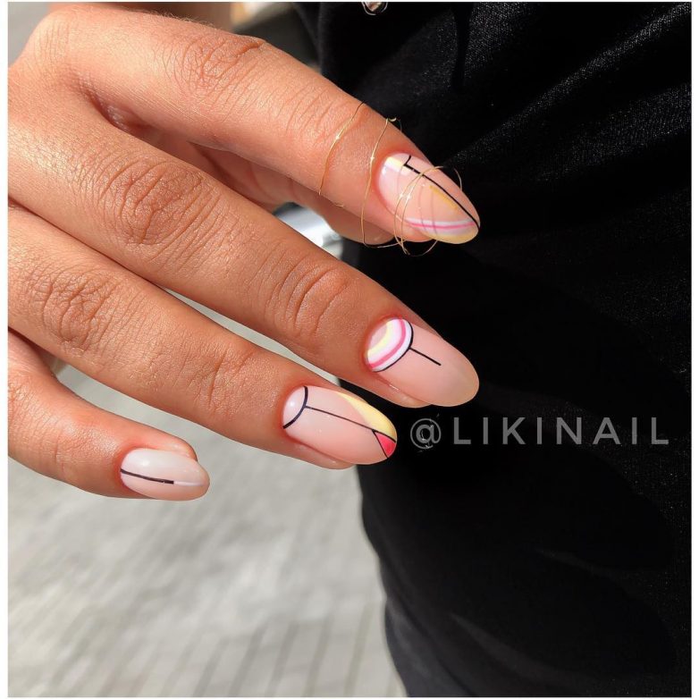 Линии или разводы в хаотичном порядке смотрятся интересно и необычно. Делается такой маникюр достаточно просто. Не нужно рисовать все ногти похожими друг на друга. Используйте линии разных цветов, толщины, направления. Предпочтение стоит отдавать ярким цветам. В качестве декора используются рисунки, наклейки или стразы.