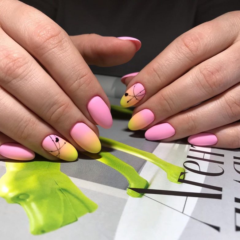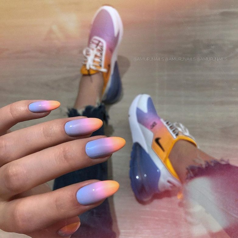 Переходы от одного цвета к другому всегда смотрятся интересно. Особенно, если использовать необычные цвета. Можно сделать градиент на всех ноготках или наоборот только на одном.