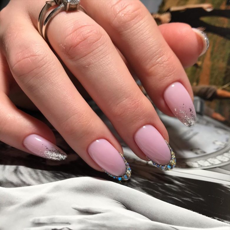 Для разнообразия можно выделить один ноготок обратным градиентом. Декорировать такой маникюр можно всем, что найдется в вашем маникюрном арсенале. Блестки, стразы или цветная пудра. Выбор за вами.