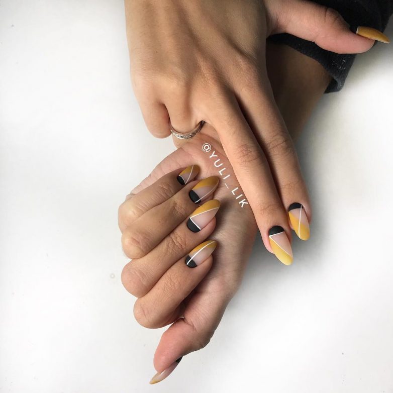 Например, черные блестки. Кстати, в этом году они тоже будут популярны. Линию улыбки можно сделать как классической, так и косой.