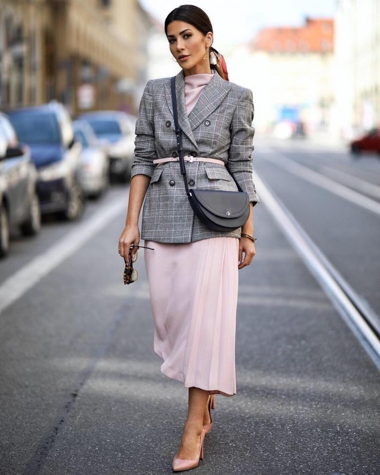 Вы можете создать образ с костюмом двойкой. Лучшие цвета для последнего: коричневый, бежевый, черный, белый, синий, бордовый, темно-зеленый и так далее. Главное, чтобы цвет был несколько приглушенным. Обувь должна здесь быть максимально закрытой. Прекрасно подойдут туфли-лодочки или туфли на танкетке. А из аксессуаров достаточно использовать ремень, строгую каркасную сумку и, к примеру, шарфик. Если вы составляете образ с юбкой и блузой или платьем не забудьте дополнить лук телесными колготами.