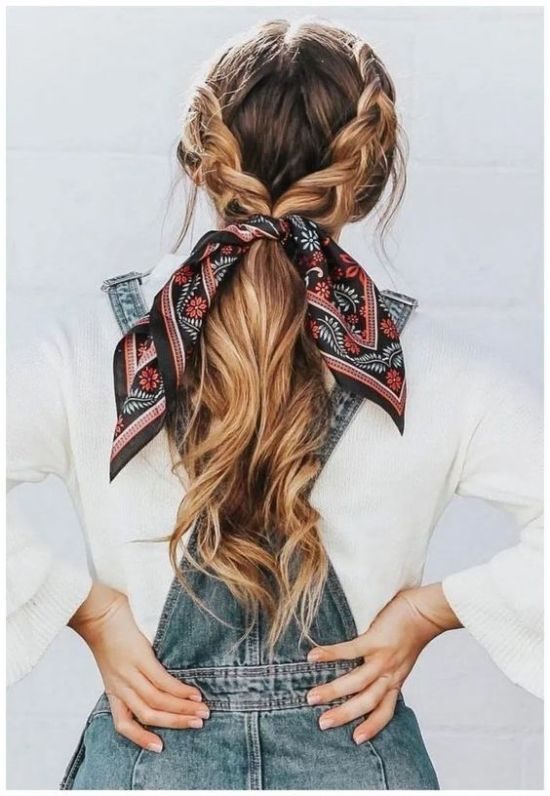 Две вплетённые косички, собранные в хвостик тонким платком