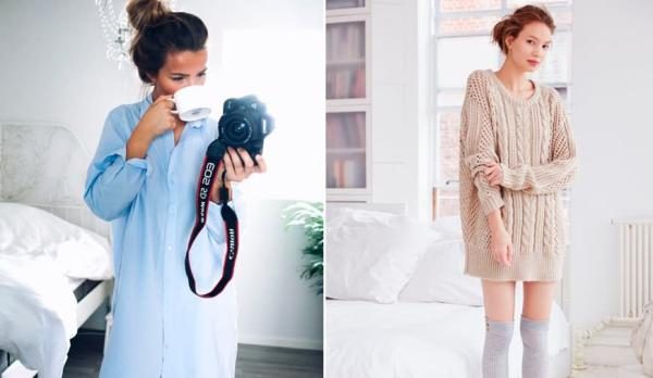 Длинные рубашки – классика жанра. В этой одежде девушка всегда выглядеть модно и ухоженно; Лёгкие костюмы с юбкой или шортами тоже будут отлично смотреться на фоне домашнего антуража;