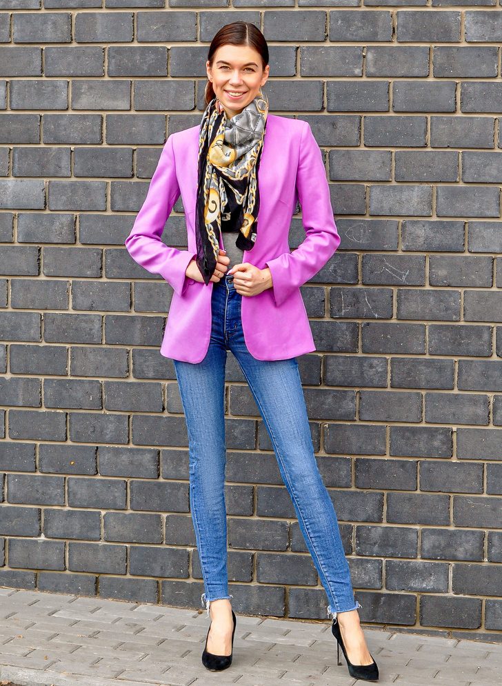 На рабочей встрече мне хотелось выглядеть представительно, но при этом не слишком официально. Мне показалось, что с этой задачей отлично справился лавандовый жакет, который стал ярким пятном в этом довольно лаконичном образе.