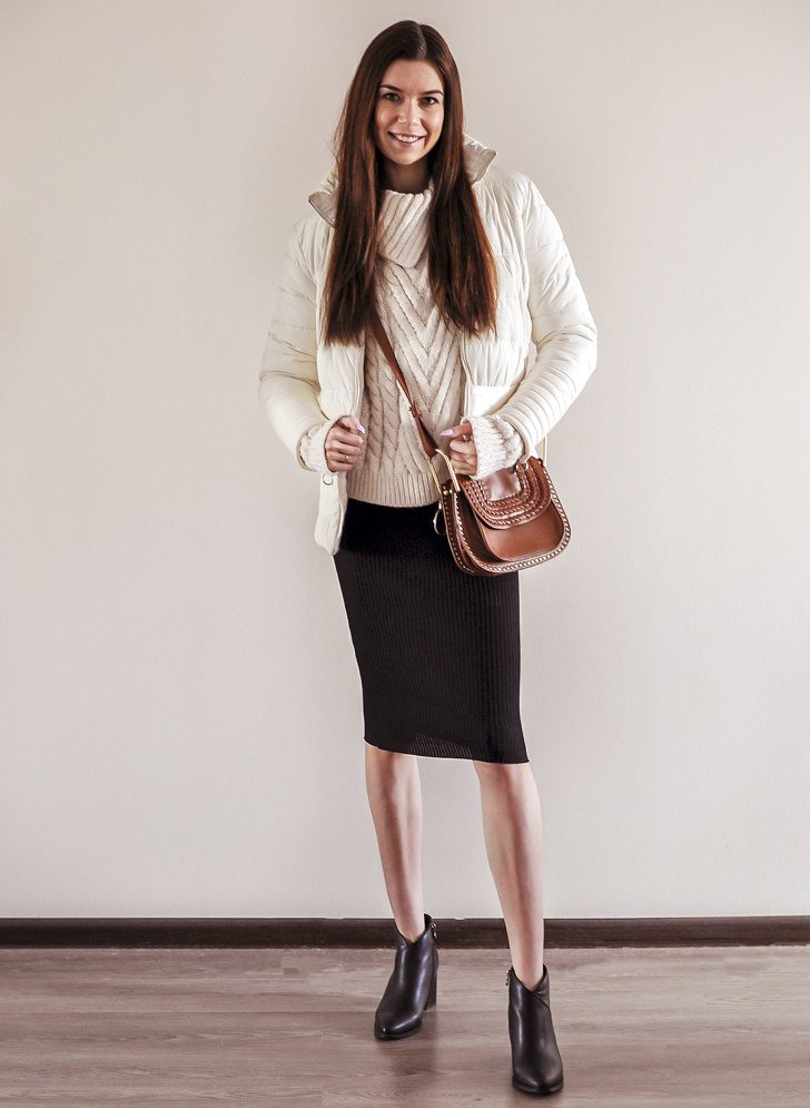 Словно по мановению волшебной палочки, мое платье превратилось в юбку. Сверху я надела свитер и теплую куртку. Чтобы внести в образ немного разнообразия, я взяла коричневую мини-сумку.