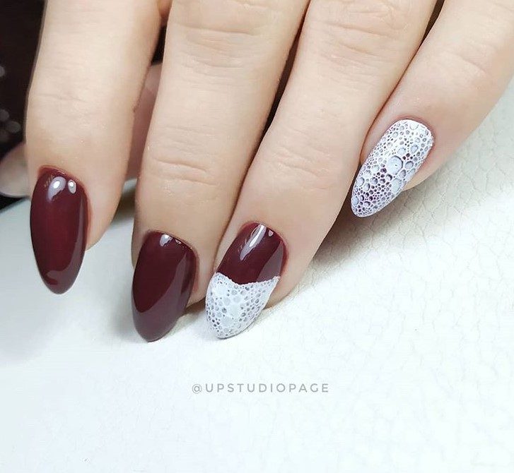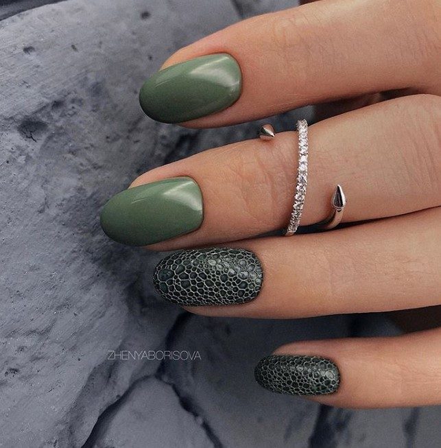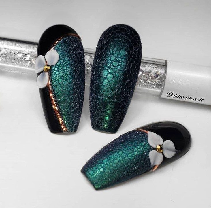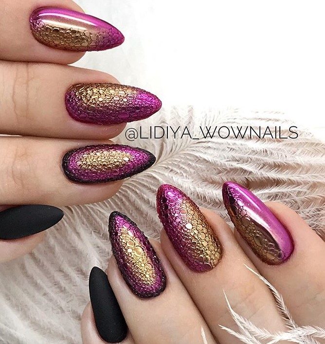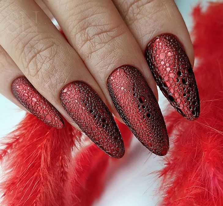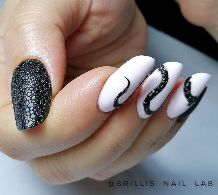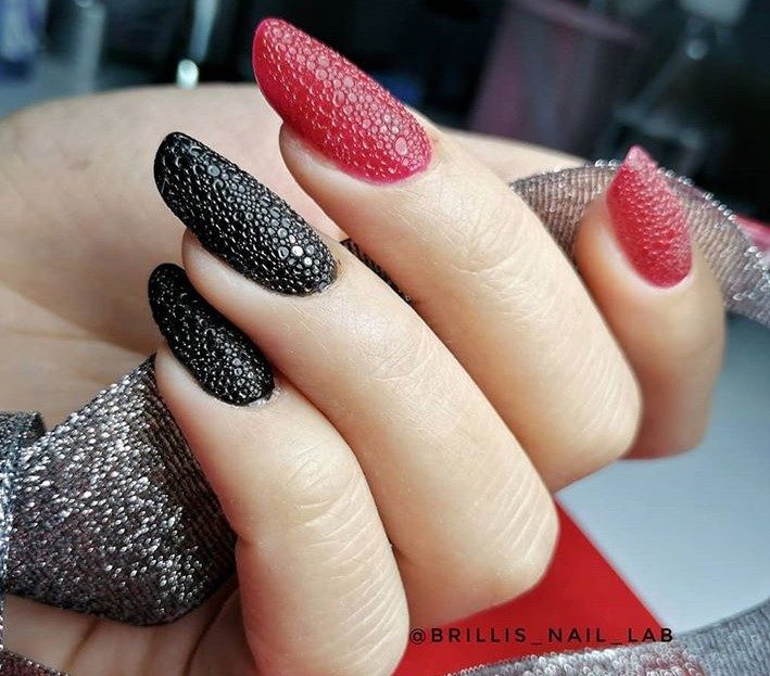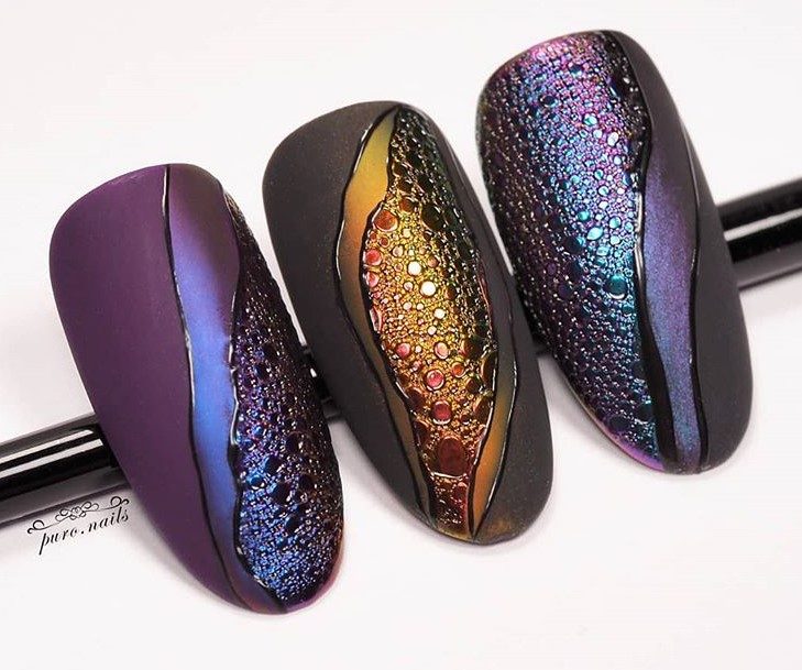 Пузырчатый рельеф может покрывать поверхность одного ногтя или абсолютно всех. Выделите один или два пальца, сделав на них отличающийся от остальных маникюр.