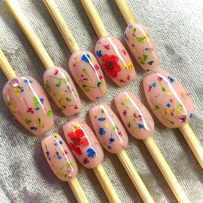 Накладные ногти не обязательно должны выглядеть как стилеты, сейчас огромный выбор коротких вариантов. Как оказалось, накладные ногти тоже могут смотреться мило и аккуратно с нюдовой основой и цветочным дизайном. Если длинные ногти не по душе, выбирайте сразу короткие: подпилить искусственные ногти практически невозможно, а отрезаются они специальными кусачками. Конечно, можно попробовать и ножницами, но есть риск отклеить их из-за давления.
