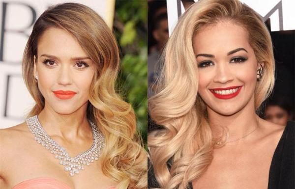 Здесь секрет визуального уменьшения лица заключается в двух вещах: объеме локонов и смещения черт лица за счет косого пробора. Первый прием перетягивает на себя внимание и в пышно завитых локонах лицо просто «теряется». Второй прием действует за счет того, что большинство людей воспринимает только прямой пробор, и когда его линия переносится, то пропорции лица смещаются тоже и выглядят худее.