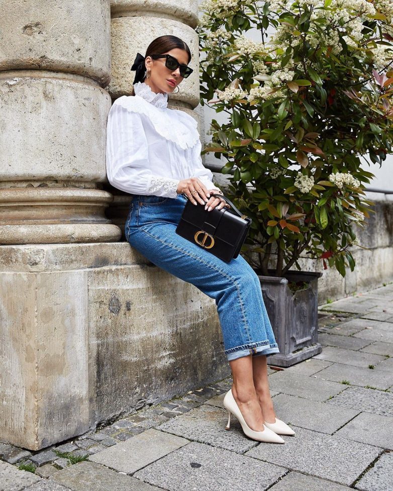 Если ваш рабочий дресс-код позволяет некоторые вольности, присмотритесь к модным джинсам скинни, клеш или прямым классическим, которые очень удачно будут смотреться с элегантными блузами, украшенными рюшами или воланами, а также стильным принтом.