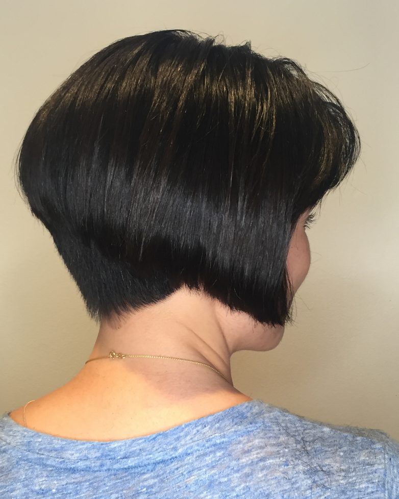 Одной из самых востребованных причесок у возрастных женщин является боб на ножке. Затылочная часть коротко выстригается, даже выбривается. Передние пряди оставляют довольно длинными. Они доходят временами до плеч. Прическа смотрится экстравагантно, но невероятно молодит дам. Это и прельщает женщин, старающихся не поддаваться влиянию времени и всегда выглядеть свежо и привлекательно.