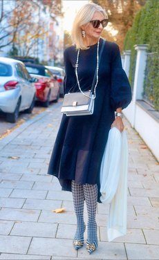 Телесные колготки вообще строго запрещены во всех возрастах, об этой модной ошибке можно прочесть тут. Но то ли скрывая возрастные изменения, то ли по привычке, женщины после пятидесяти продолжают носить их. Так вот, если вы решили создать образ с колготками, лучше выбрать черные, если позволяет фигура — с небольшим рисунком. Помните, в телесных колготках ваши ноги становятся другого цвета, нежели все остальное ваше тело, и это выглядит некрасиво!