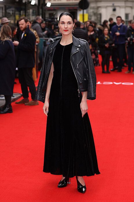 Косуха в сочетании с длинным лаконичным платьем из черного бархата — неожиданное решение для красной дорожки, которое выглядит стильно и подходит для обычной жизни. За счет макияжа и обуви вы можете варьировать настроение такого образа от брутально агрессивного до строгого или сексуального.