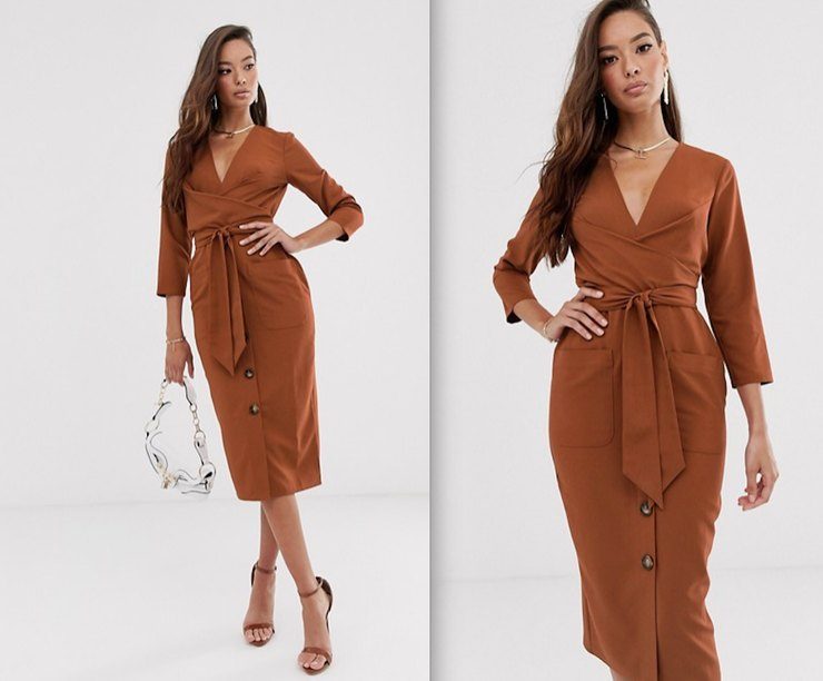 Еще один вариант, который можно смело выбирать длинной ниже колена — платье с запахом. Такие платья любой длины смотрятся хорошо, особенно миди и макси. Единственный вариант который может добавить вам лет, это если платье будет похоже на бабушкин халат в цветочек. Тут уже длина не играет никакой роли. Поэтому лучше выбирайте платья из более жестких тканей и модели лаконичного кроя.
